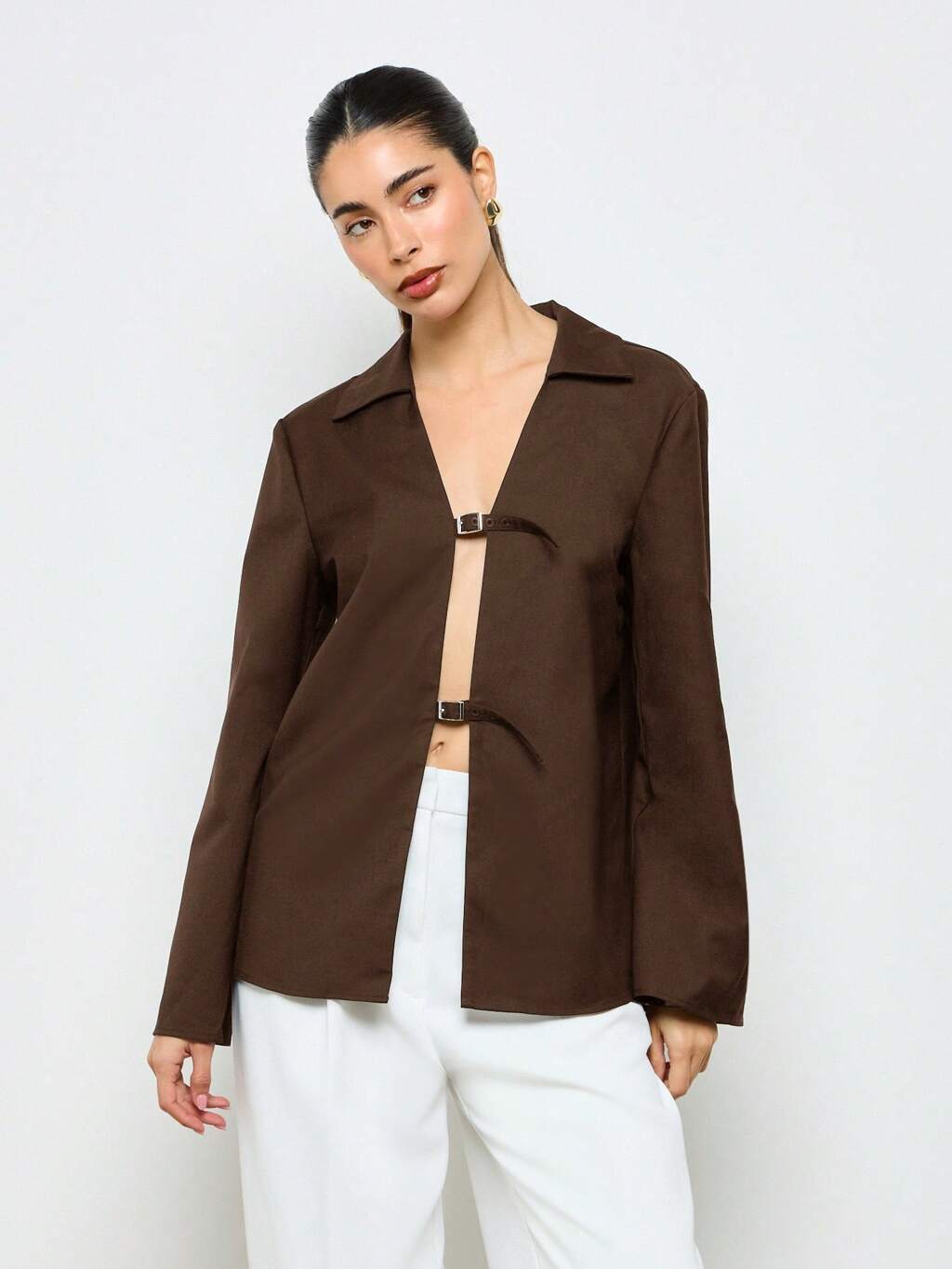 Elegant Satin Long Sleeve Blouse With Double Buckle Detail