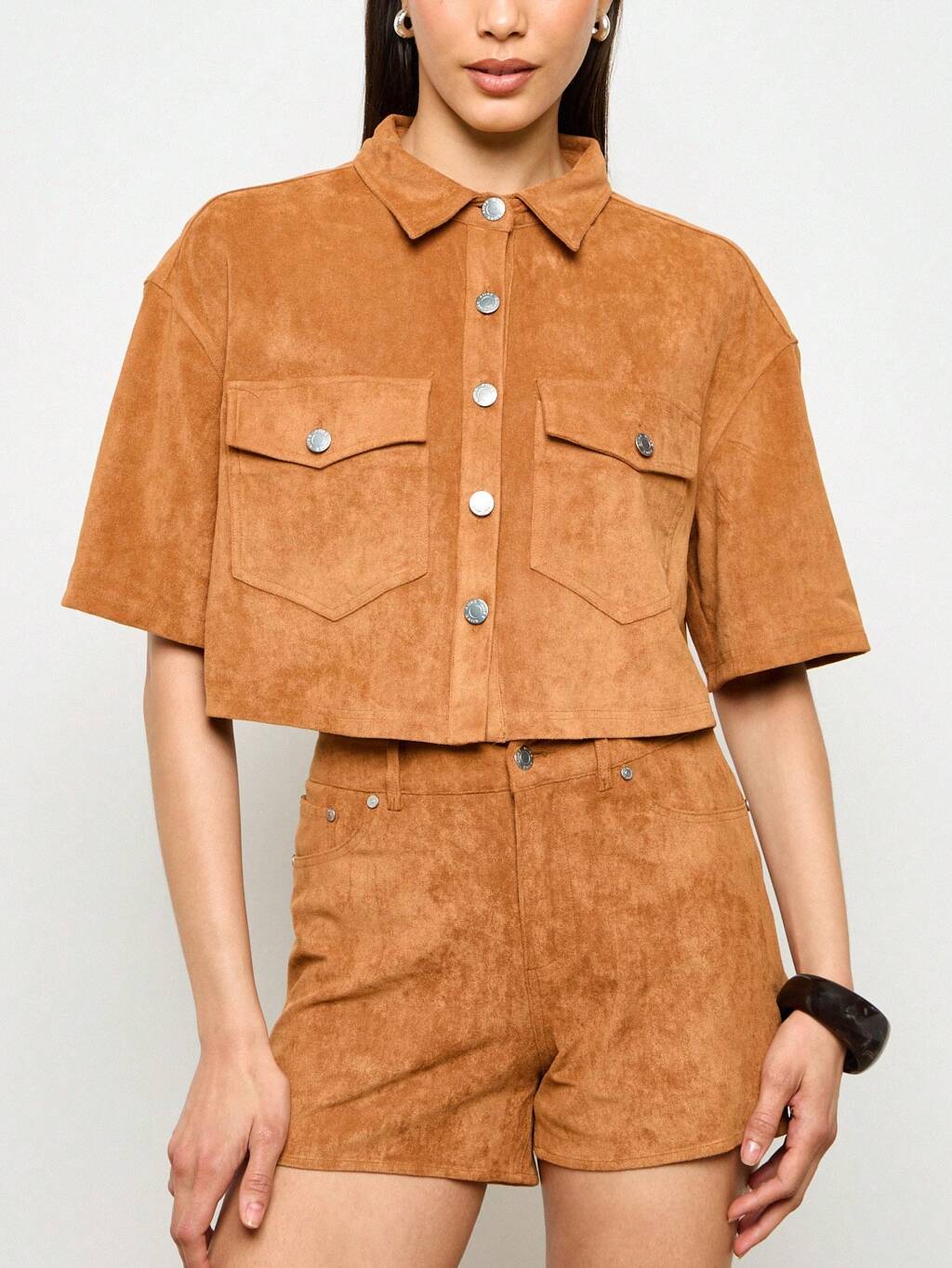 Suede Crop Button-Up Short Sleeve Collared Top