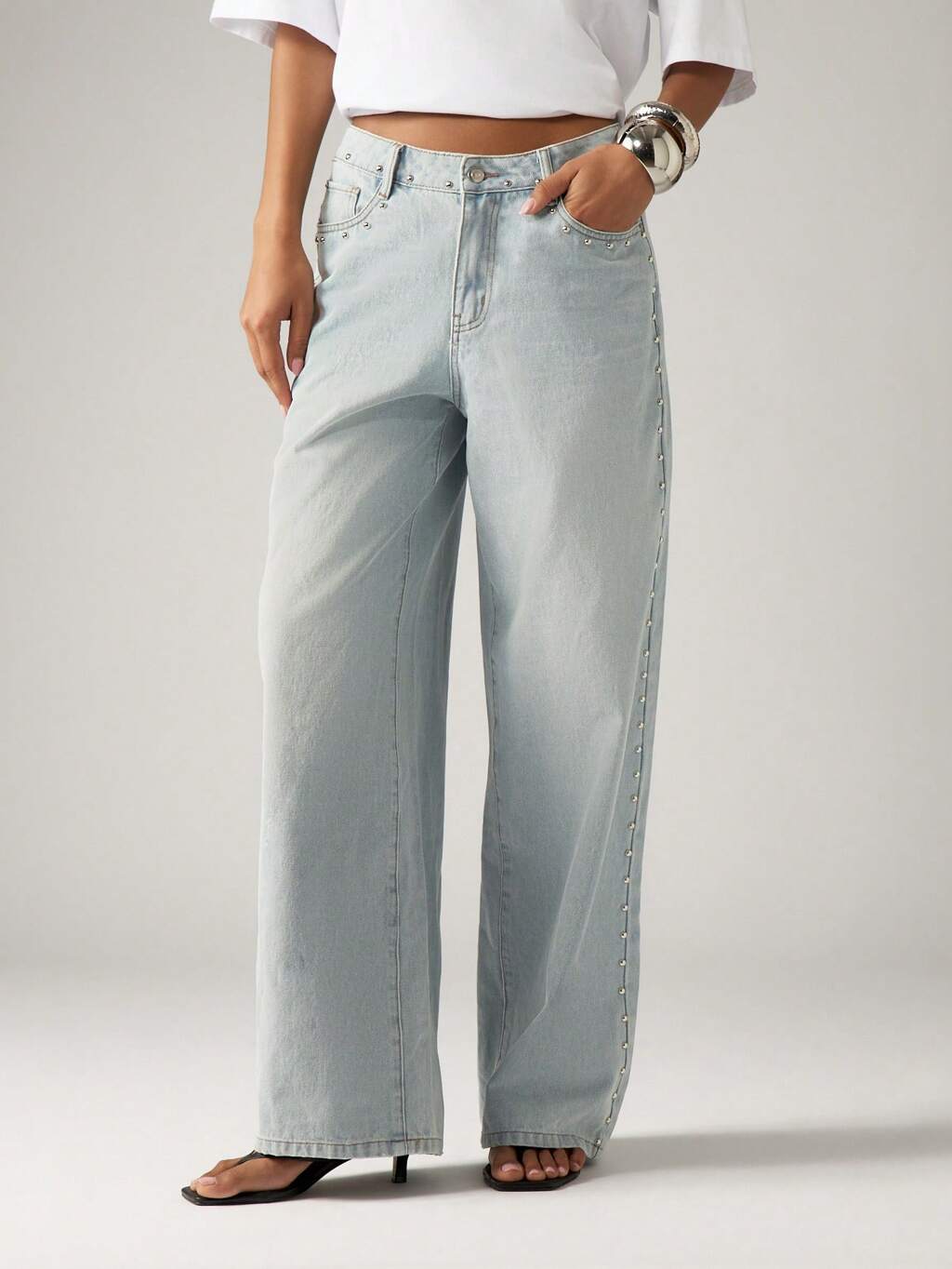 Wide Leg Baggy Jeans With Rhinestone Detail