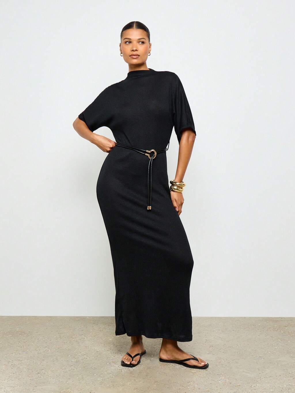 Belted Mock Neck Long Length Dolman Sleeve Maxi Dress