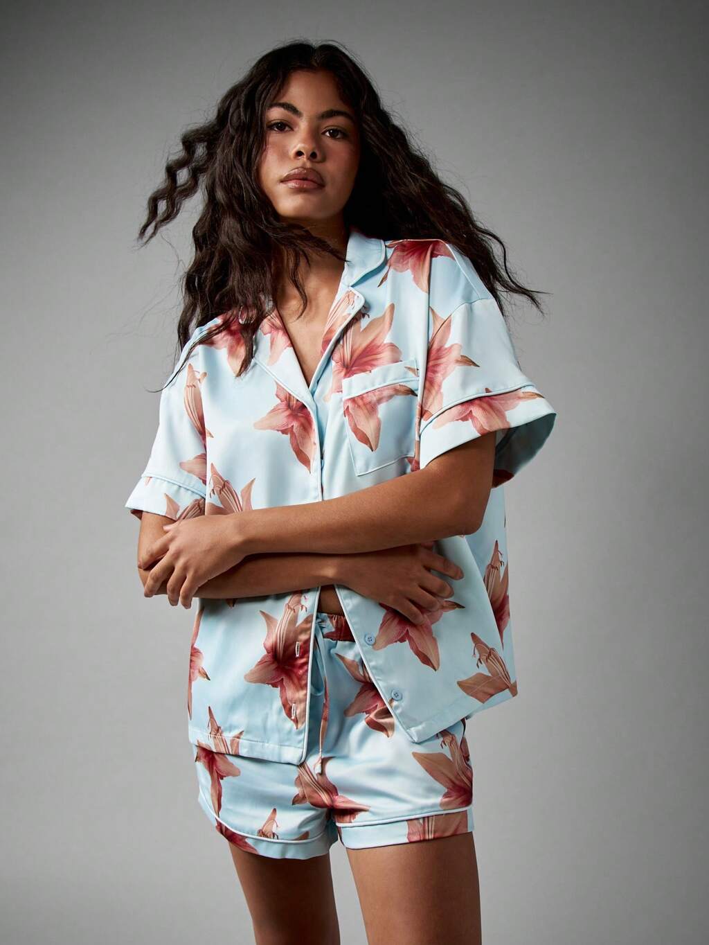 Ensemble pyjama boutonné en satin à imprimé floral avec short