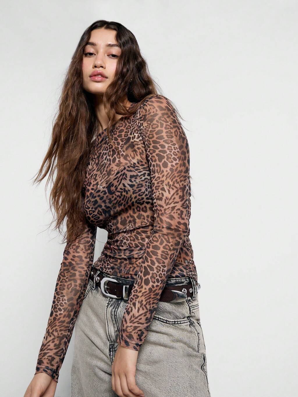 Prześwitujący top z nadrukiem w panterkę i długim rękawem, okrągłym dekoltem i dopasowanym dekoltem