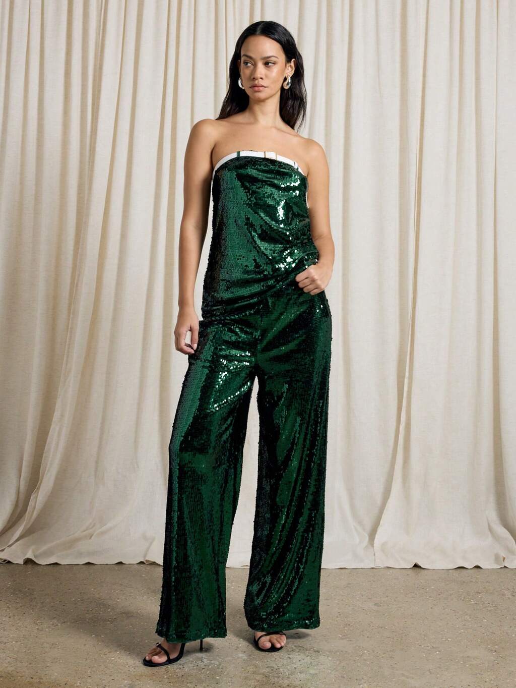 Bluzka bandeau z cekinami i szerokimi nogawkami